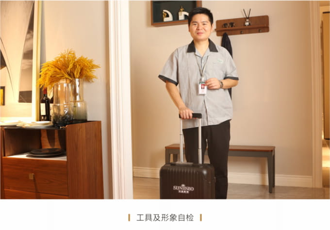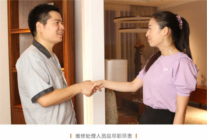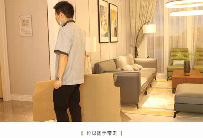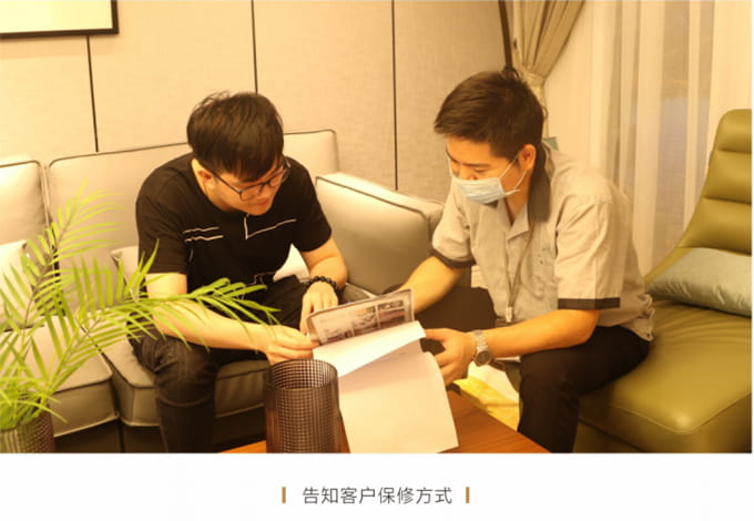 產(chǎn)品處理完畢后必須一站式通檢,指導客戶使用,并將服務(wù)過程中產(chǎn)生的垃圾隨手帶走,家具維修完畢后,應(yīng)用毛巾將家具擦拭一遍,確保產(chǎn)品清潔。