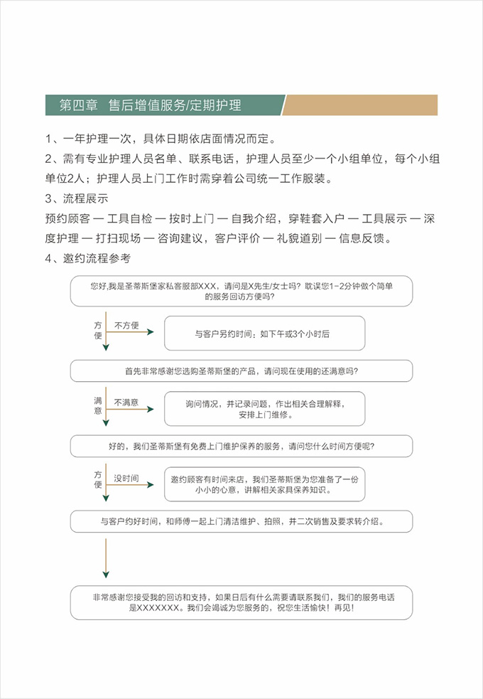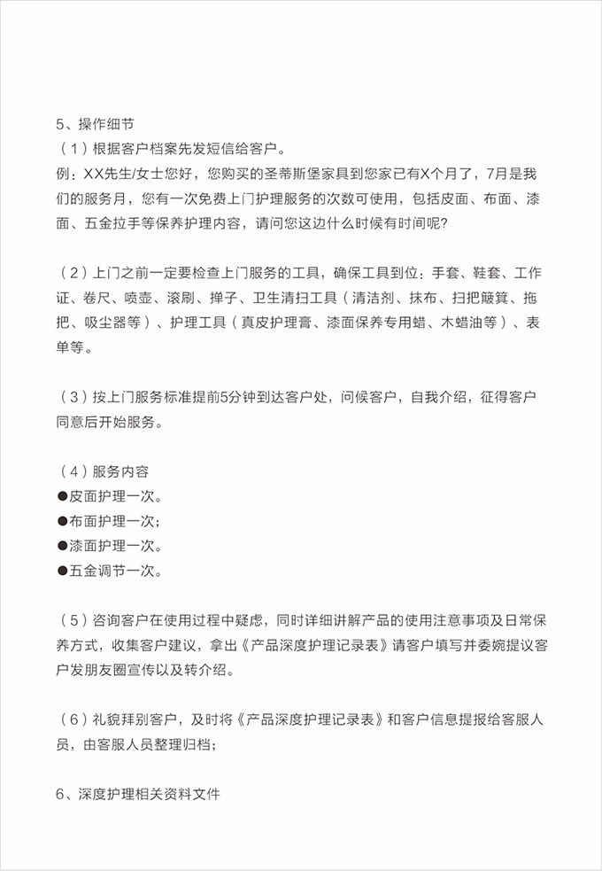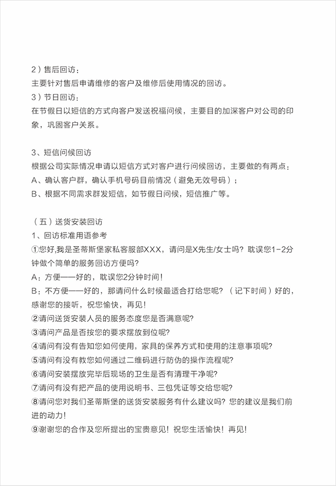 話術(shù)參考:“**先生/女士您好,我是圣蒂斯堡的售后服務(wù)人員**,您購買的圣蒂斯堡家具已經(jīng)全部到貨了,送貨安裝大約需要**時間,請問您這邊什么時候方便我們上門送貨安裝呢?”同時要了解送貨小區(qū)的電梯、樓道、入戶門的尺寸等,提前做好準備,避免意外情況。最后確定送貨時間(安裝所需要時長),并告知客戶安裝人員的相關(guān)信息,可加微信發(fā)送,并發(fā)送配送安裝流程說明。