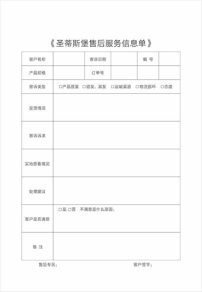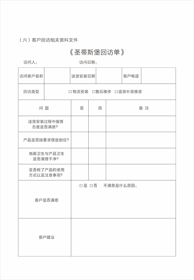 告別之前:告知客戶圣蒂斯堡全國免費服務(wù)電話(售后服務(wù)貼)以及保修方式,請客戶在《產(chǎn)品配送單》上簽名,并填寫《配送滿意度調(diào)查表》后,合影留念。