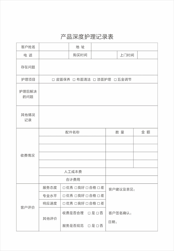 按要求認真填寫服務(wù)記錄單據(jù)并請顧客填寫相應(yīng)內(nèi)容及簽字,離開顧客處時除了與顧客本人告別外,還需要向有關(guān)負責人打招呼,詢問是否還有其他問題,當?shù)玫筋櫩偷臐M意允許后,方可離開。