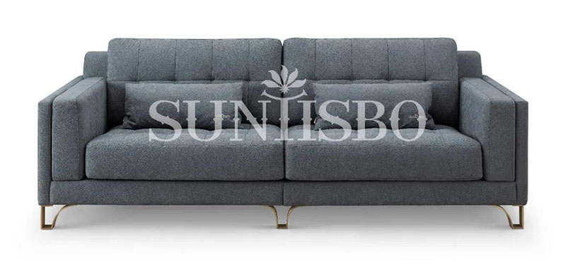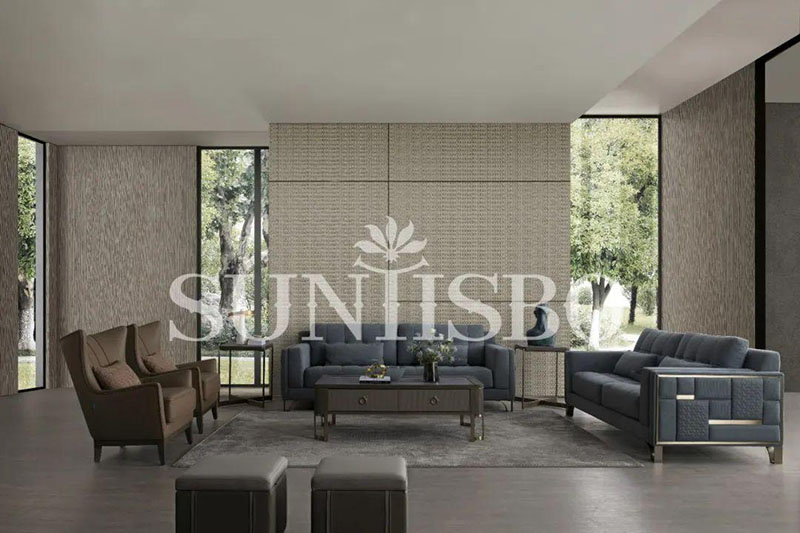 沙發(fā)采用細(xì)膩的顆粒感皮料,不僅增加了霧霾藍(lán)色彩的飽和度,也在視覺上充實(shí)了空間的安全感。輪廓,扶手皆為干練利落的直線,放眼望去不僅簡(jiǎn)化了空間,也傳達(dá)著對(duì)精簡(jiǎn)生活的追求。