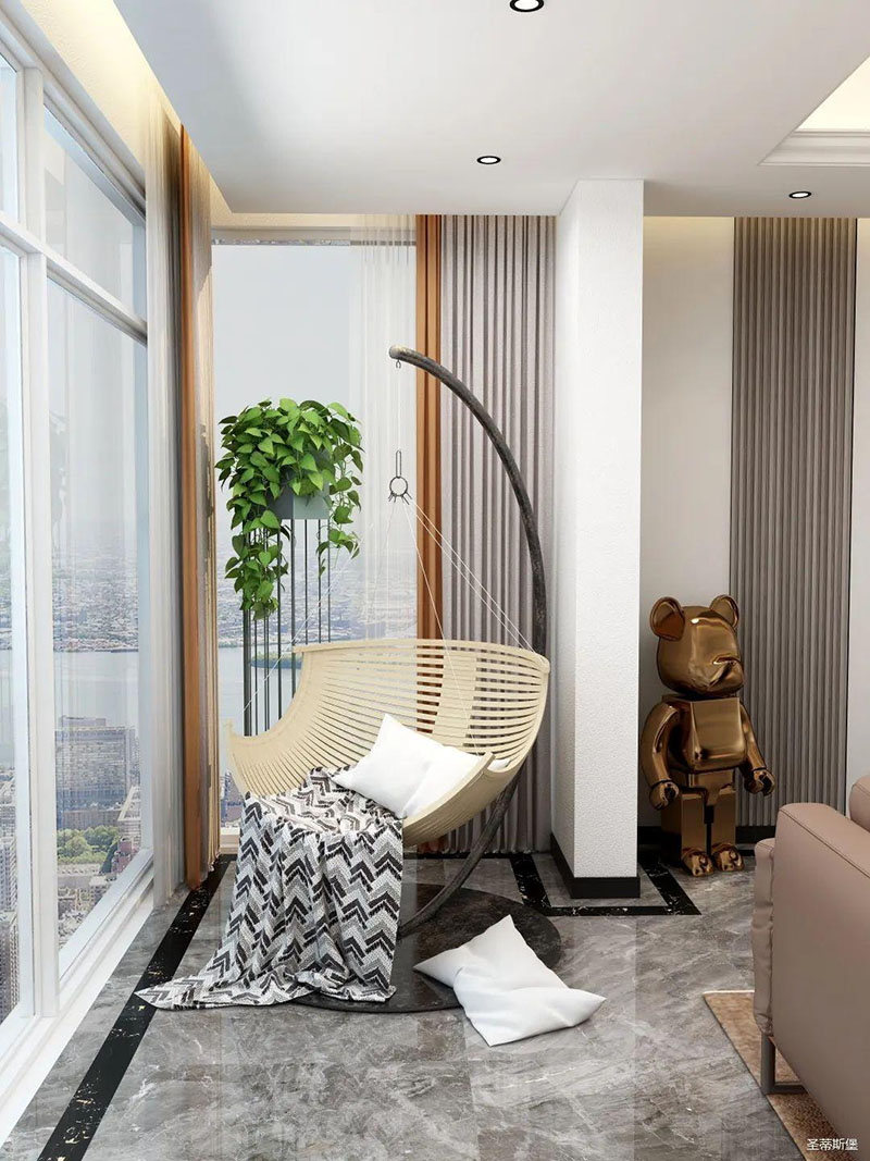 陽(yáng)臺(tái)上大面積的落地窗,將頂層的位置優(yōu)勢(shì)完美展現(xiàn),視野與采光都得到了保證,站在窗邊就能俯瞰蒞臨江湖的城市美景。陽(yáng)臺(tái)上留一隅悠閑的小角落,置入竹編狀的吊椅,閑暇時(shí)光都可以在這度過(guò)。