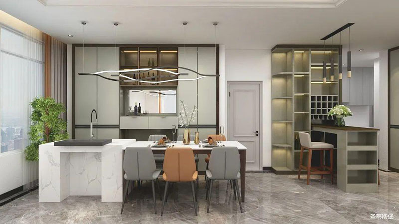 餐廚開(kāi)放式設(shè)計(jì),令空間更為清透明亮。色系一致的餐邊柜,封閉與開(kāi)放式儲(chǔ)******立又統(tǒng)一,正面鑲嵌玻璃,延伸了視覺(jué)空間,僅用簡(jiǎn)約線條區(qū)分,將意式極簡(jiǎn)形式展現(xiàn)。造型別致的金屬線條燈飾,給整體空間帶來(lái)了靈動(dòng)感。