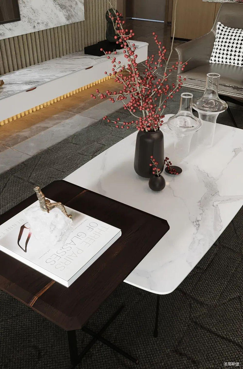 純美的線條,沉穩(wěn)的色澤,為空間定下了低調(diào)而華麗的基調(diào)。渾然天成的實木與巖板紋理,讓角幾蕩漾出一幅“水光瀲滟”的潑墨油畫。三兩紅枝點綴,表達著“枝頭并蒂祝吉祥”的美好祝愿。光影透過極簡金屬幾腳,折射出一種隱藏的優(yōu)雅氣質。大小、高低不一的天然材質角幾組合在一起,時尚又個性,不僅便于移動,還表現(xiàn)的靈活且輕巧。
