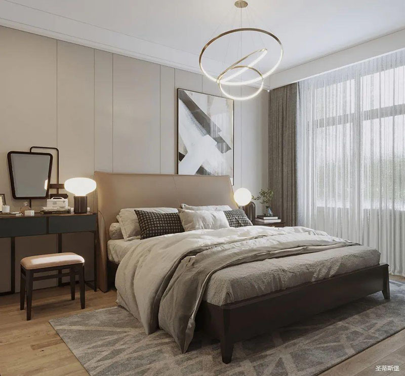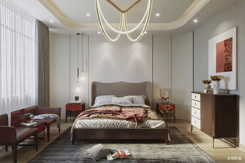 靈活變裝的主臥空間,自成獨特的設計語言與真摯的感情糅合。經(jīng)典意式極簡軟床,流暢順滑的真皮床屏,賦予了空間溫馨高貴的氣息。酒紅實木質感的床頭柜,整齊擺放,欲有“鴻運當頭”的美好寓意,塑造出一方簡約知性的靈動空間。