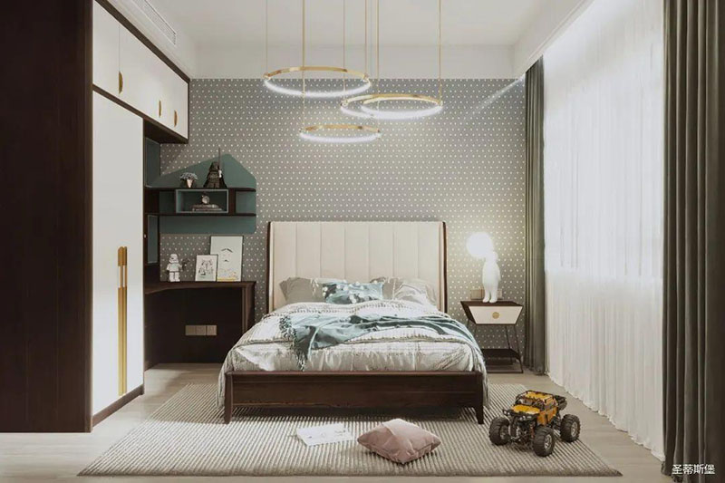 桌柜一體接壤設計,絢麗與沉穩(wěn)相互襯托,足以達到空間最好的狀態(tài)。飽和又柔潤的色塊,整齊坐落于床體柜身,通過極簡規(guī)劃分配,刻畫出完美的實木紋理。造型獨特的床前燈,像一抹陽光照進心扉,散發(fā)著童真與夢幻的味道,形成了獨有的輕奢精致感。
