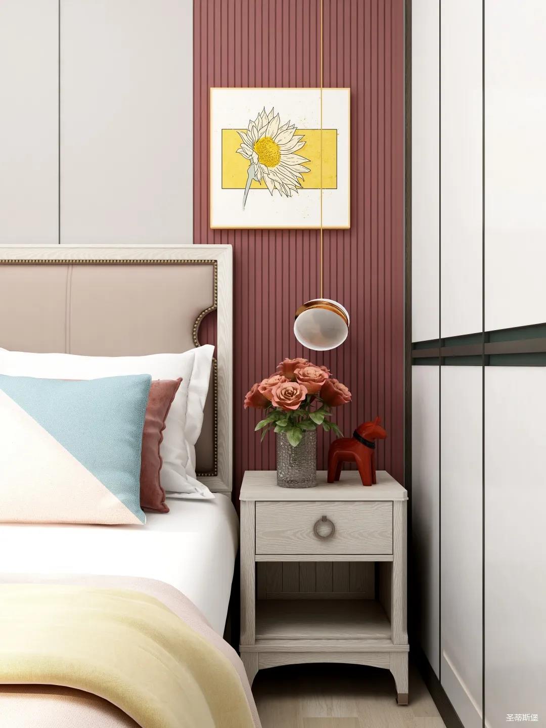 兒童空間雖不及其他空間寬敞,但細節(jié)設計更為貼心,淡粉的床屏與酒紅木飾面形成深淺色的對比,色彩跳躍,洋溢著兒童應有的青春活力。床前的閱讀燈,讓空間設計感up的同時,也便利了兒童的閱讀學習。
