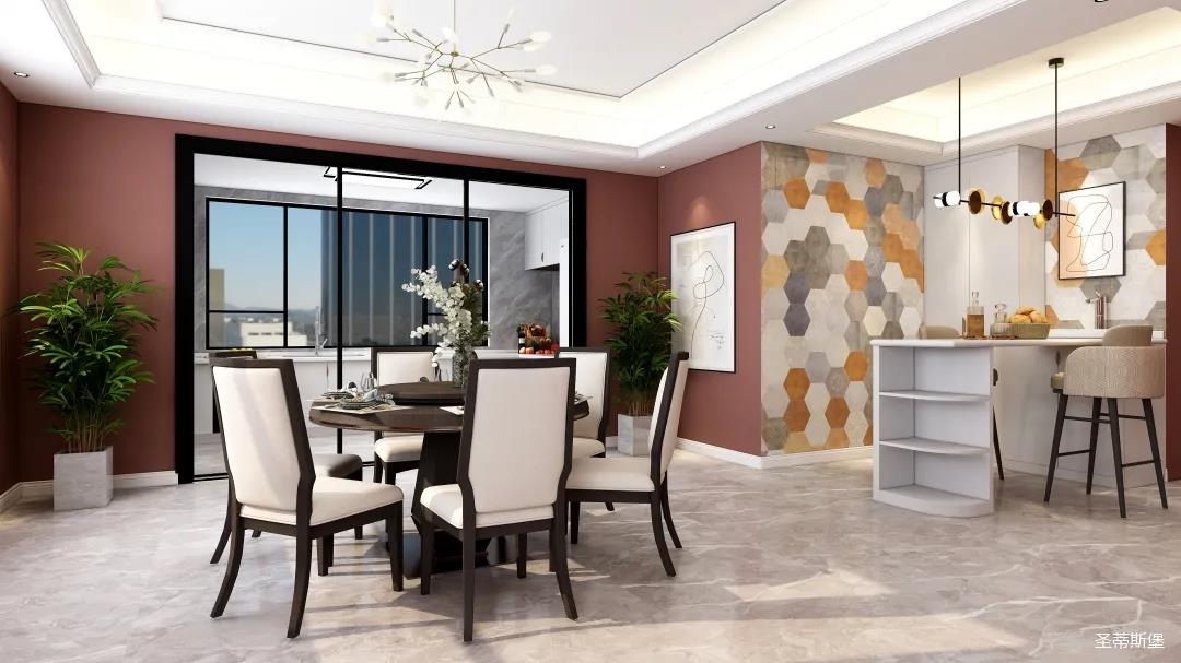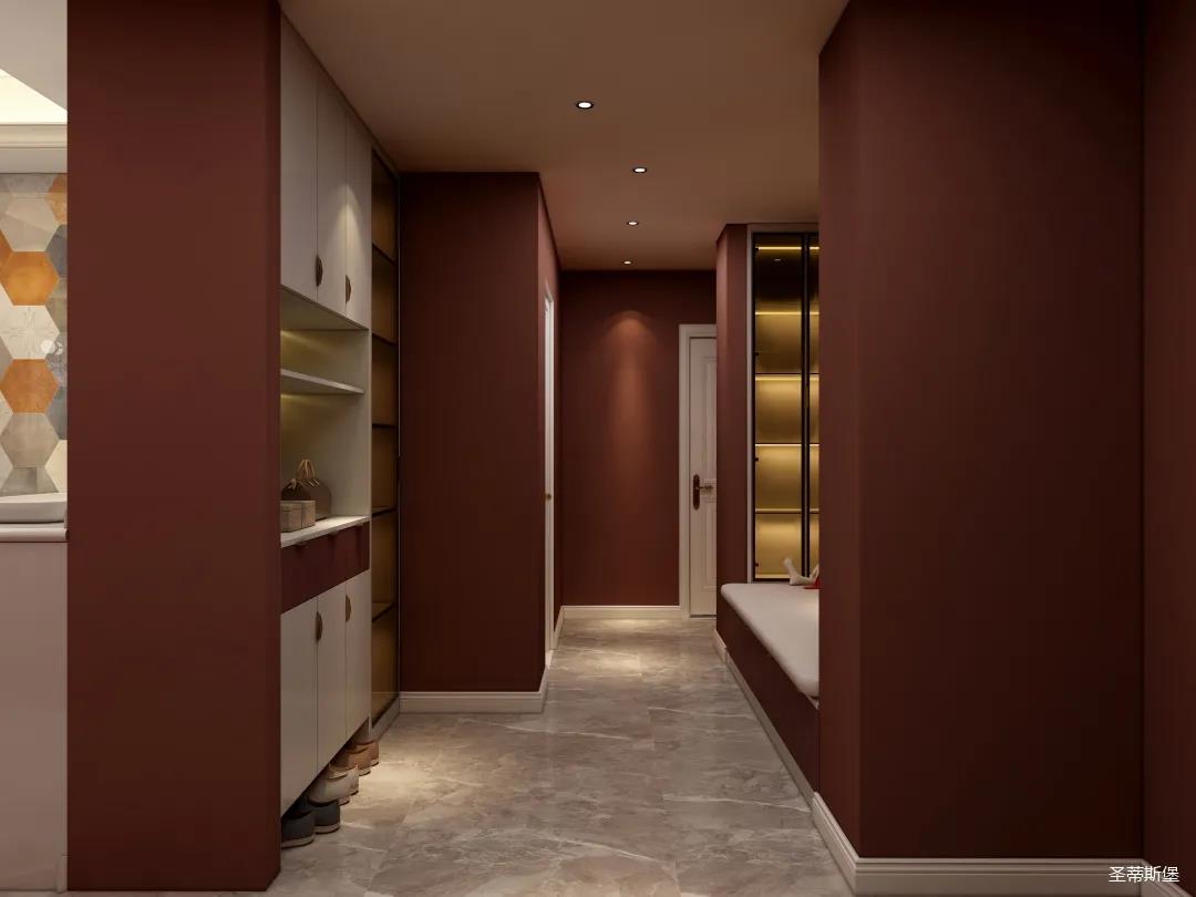 表姐不喜歡大白墻設(shè)計(jì),于是設(shè)計(jì)師完美貼合表姐的喜好,摒棄了傳統(tǒng)的大白墻,將色彩跳躍的鐵銹紅應(yīng)用于空間,從視覺上豐富了空間的層次感。南北通透的空間布局,讓視野更為清透明亮。
