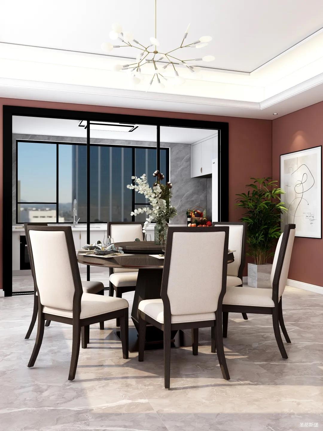 餐廳表姐更喜歡干凈素雅的氛圍,認(rèn)為圓形餐桌不僅遵循傳統(tǒng)用餐,也寓意團(tuán)團(tuán)圓圓,讓圍桌吃飯的氛圍更溫馨。因此餐廳以黑白灰為基底,用圓形餐桌布局餐廳,在有限的空間內(nèi),同時(shí)也注重功能性。