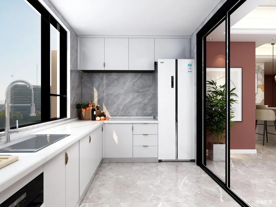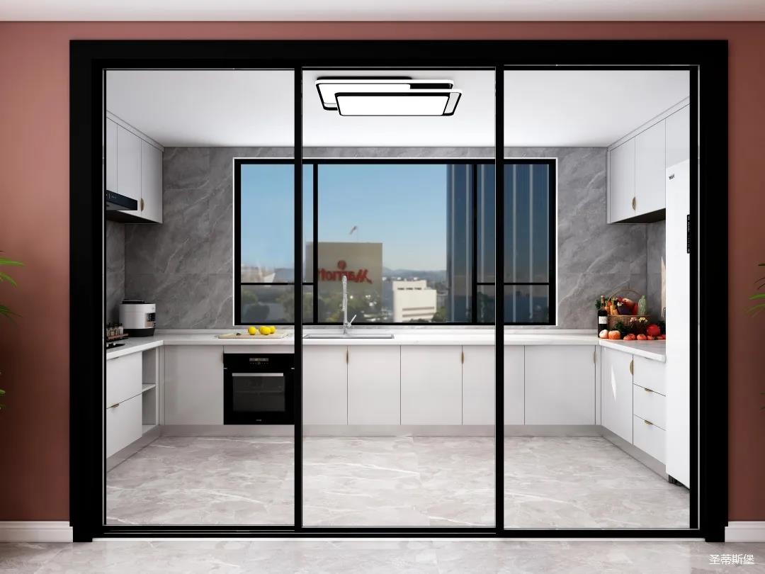 廚房是南北通透的U型空間布局,功能齊全且合理銜接,純白的柜體讓視野更開闊,用透明玻璃門隔斷,極大的提升了生活的品質(zhì)。