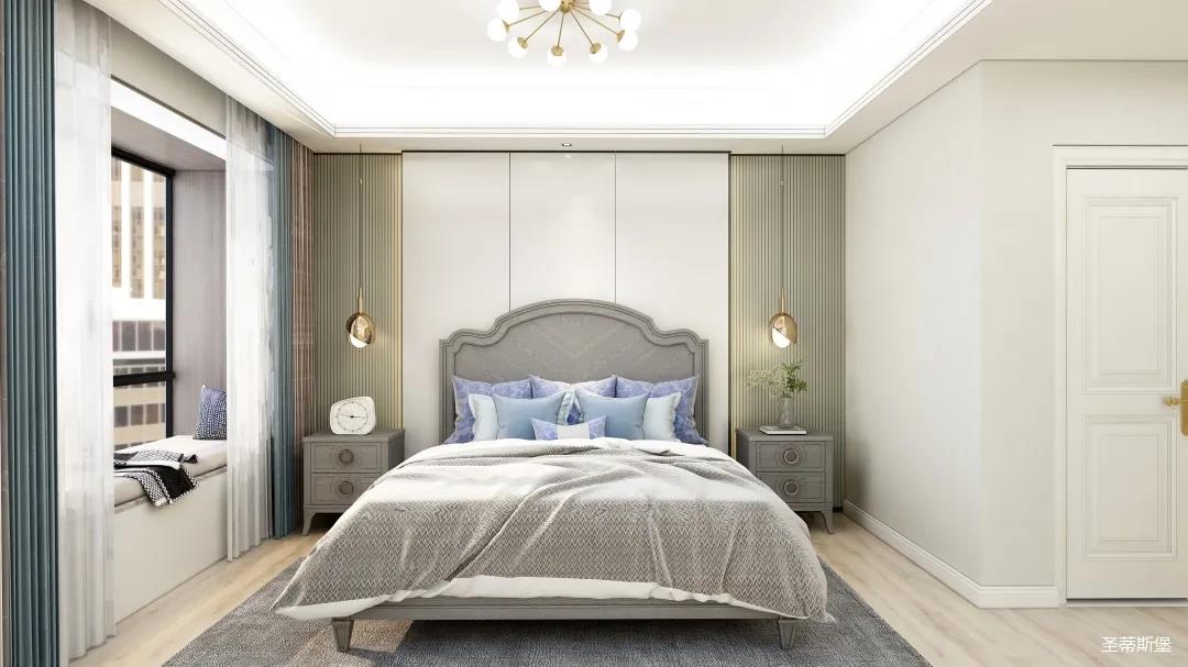 次臥的設(shè)計(jì)充滿治愈氣息,表姐打算讓兩位老人居住。莫蘭迪灰的實(shí)木感經(jīng)典再現(xiàn),沉穩(wěn)中透著時(shí)尚,流露出精致的美式格調(diào)。舍棄刻意繁復(fù)的設(shè)計(jì),簡約米白背景墻與床屏產(chǎn)生的視覺延伸,提升了空間的舒展性。金屬材質(zhì)的燈飾,以較強(qiáng)的白熾燈為主,輔助照明,將對兩位老人的關(guān)愛體現(xiàn)在細(xì)節(jié)中。