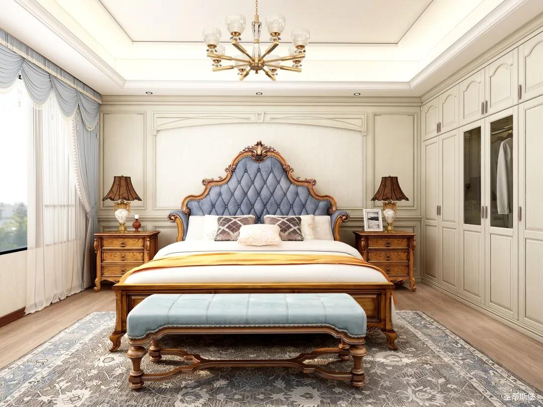 03主臥主臥設(shè)計(jì)運(yùn)用現(xiàn)代的設(shè)計(jì)手法和材質(zhì)還原了古典氣質(zhì),以干練的線條傳達(dá)著溫馨的臥房。蜿蜒的波紋曲線,細(xì)膩精致的雕花,猶如隨風(fēng)起伏的浪花,在清澈藍(lán)的床屏上跳躍,向靜態(tài)空間展示著活躍的動態(tài)效果。曲直線條完美融合,打造一個靈動而又精致的生活空間。