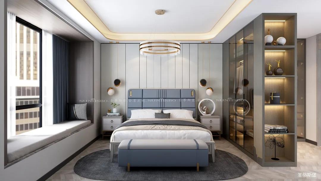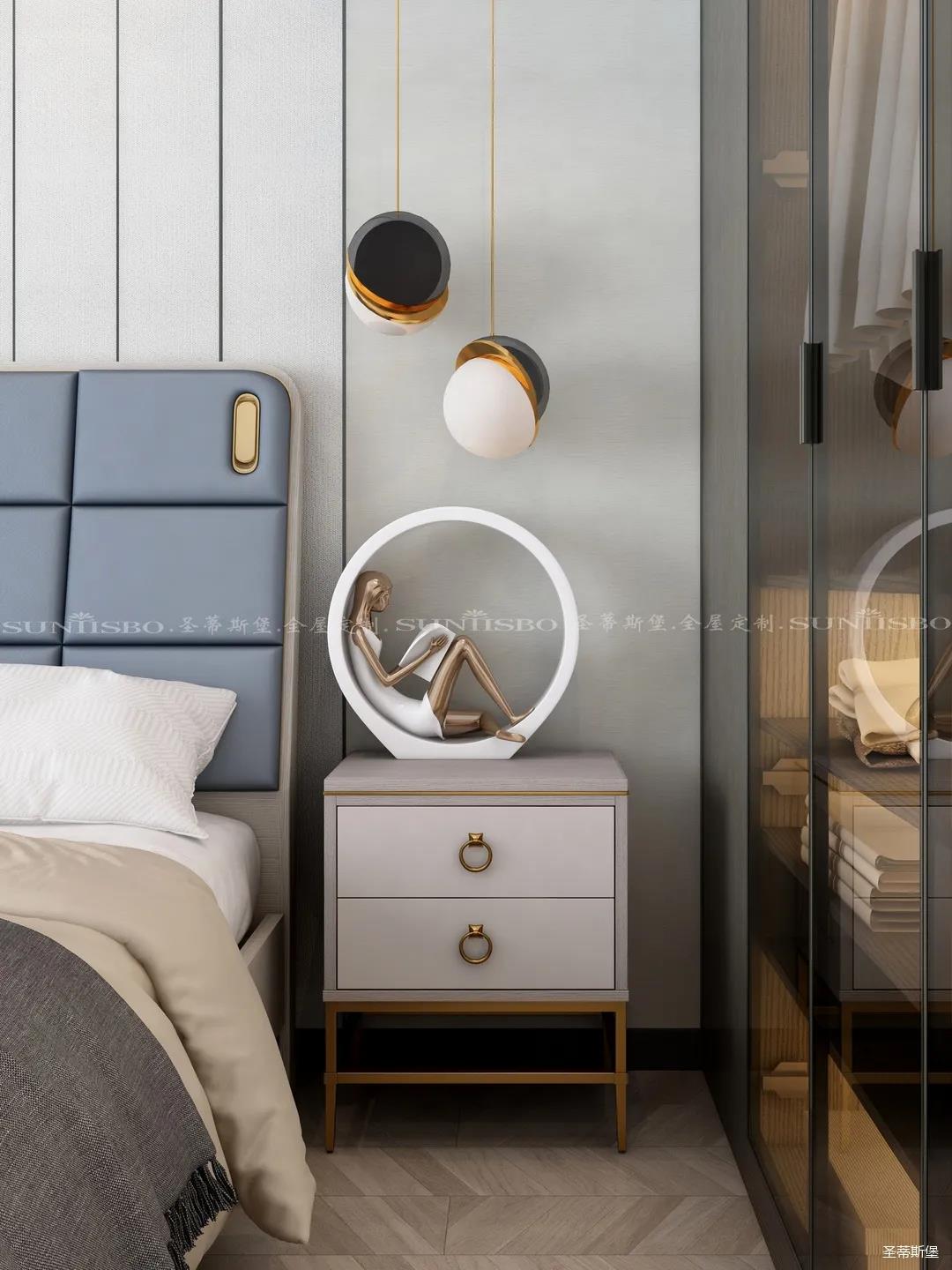 臥室的設(shè)計繼續(xù)延續(xù)著空間的高級灰,藍灰色彩的對比,讓主臥空間層次感更加豐富,充足的陽光隨意散落,空間更加溫暖大氣,對稱的球形吊燈設(shè)計,恍如兩個“快樂星球”,展現(xiàn)著空間應(yīng)有的藝術(shù)性,設(shè)計師巧妙地設(shè)計,營造出與眾不同的生活品質(zhì)。