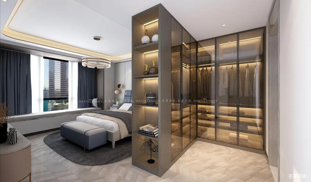 設(shè)計師不浪費每一寸空間,將主臥的大空間劃分出一個步入式的L型衣帽間,當(dāng)即隔斷了進門對床的尷尬,滿足了我一直以來擁有獨立衣帽間的夢想,它不僅是個收納場所,更是臥室的質(zhì)感體現(xiàn)。