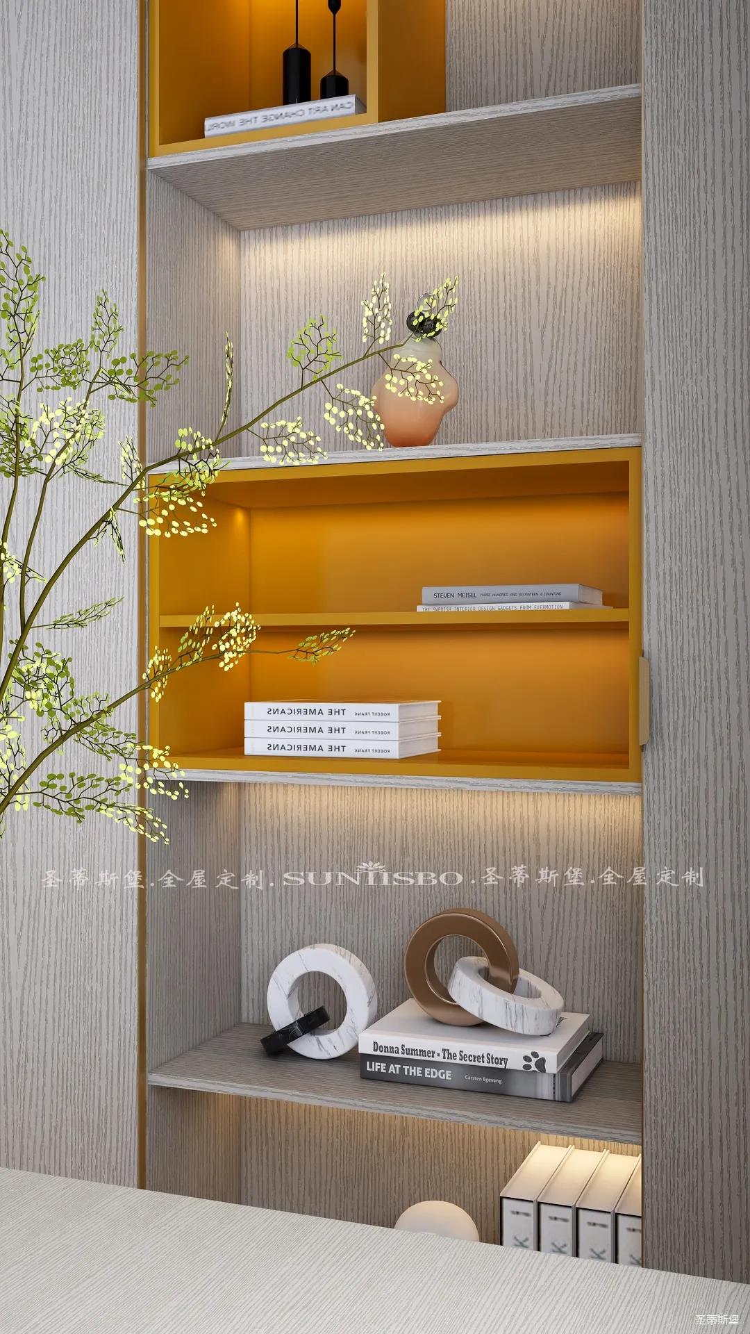 書柜點綴著適當(dāng)?shù)膼垴R仕橙,除了自身攜帶的高貴氣質(zhì),在聚焦視線的同時,還明確了收納分區(qū)。