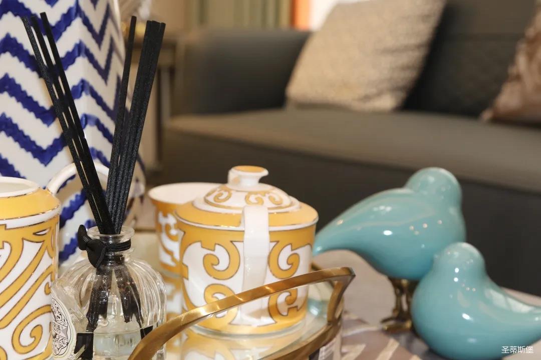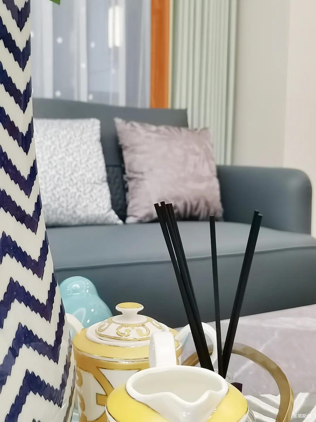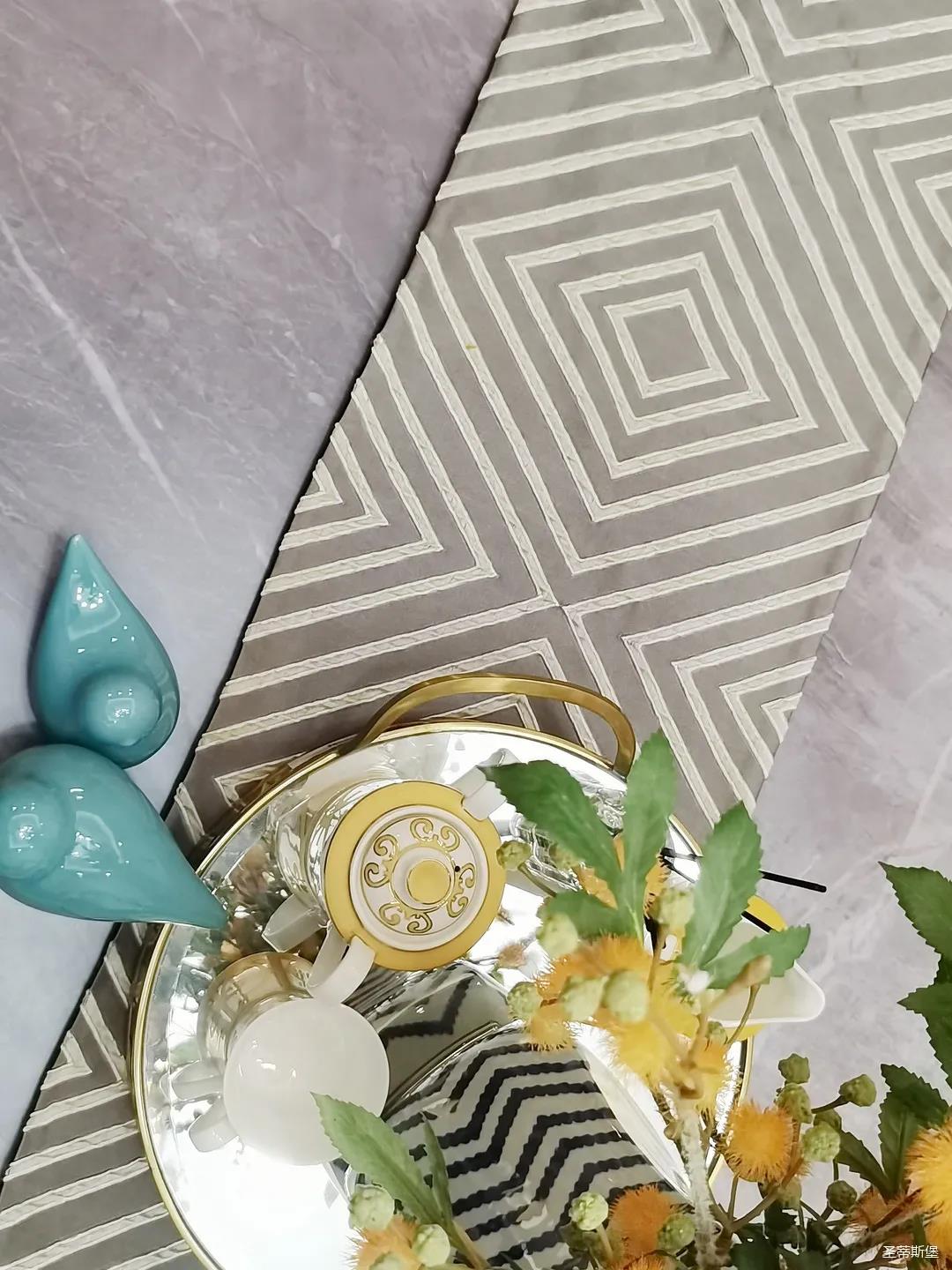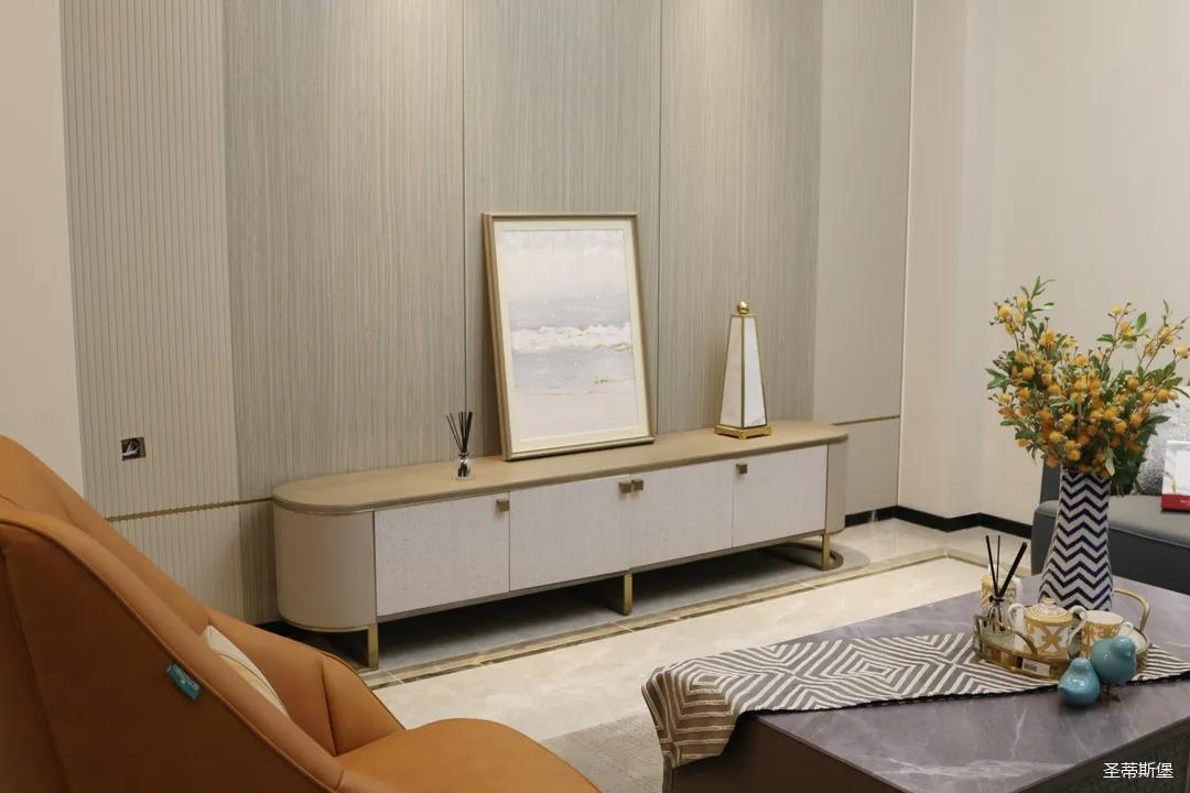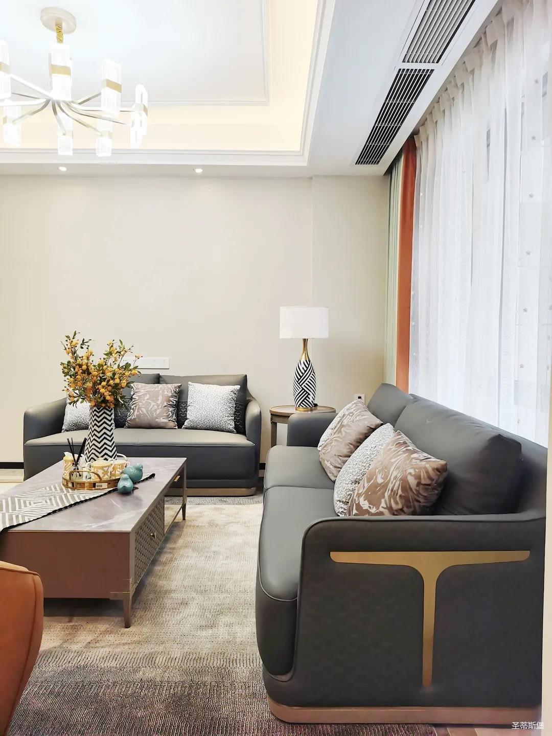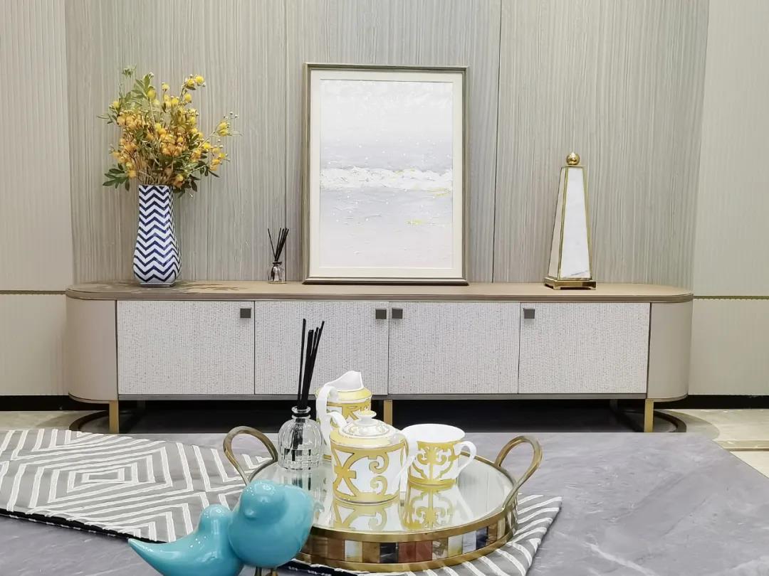 淺灰為基底的飾面與低飽和度的深色沙發(fā)相互映襯,產(chǎn)生強(qiáng)烈的視覺(jué)沖擊,深色的家具讓空間從視覺(jué)上衍生出一種縱深感。巖玻的質(zhì)感與真皮編織的紋理盡顯現(xiàn)代之美,細(xì)節(jié)陶瓷擺件注滿(mǎn)了空間優(yōu)雅的藝術(shù)氛圍。