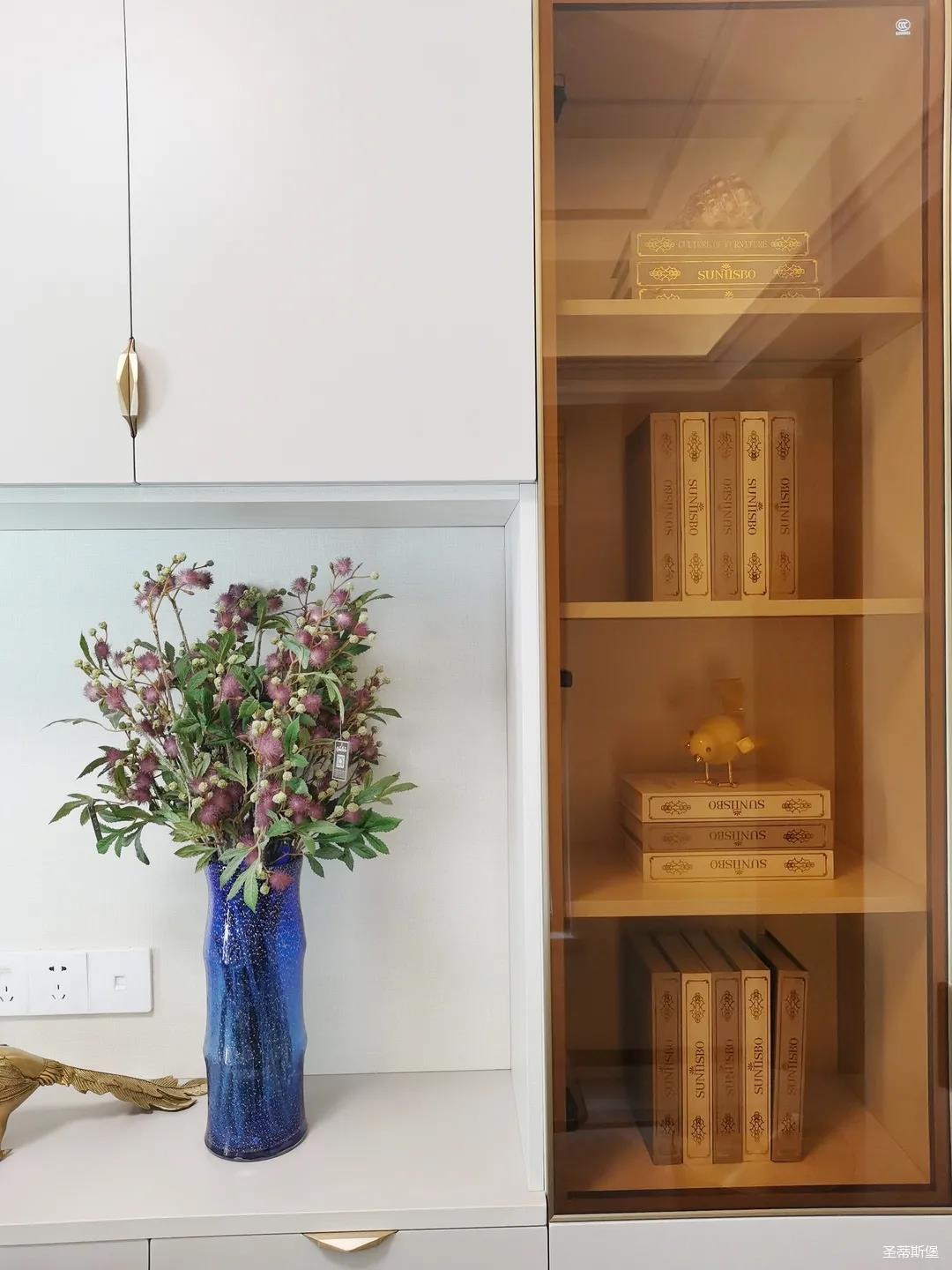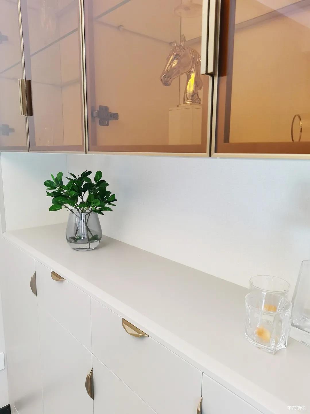 開(kāi)放式的餐廚設(shè)計(jì)讓餐邊柜和櫥柜的居家動(dòng)線更為流暢,成了最便利的收納場(chǎng)所,生活小資而又美好。