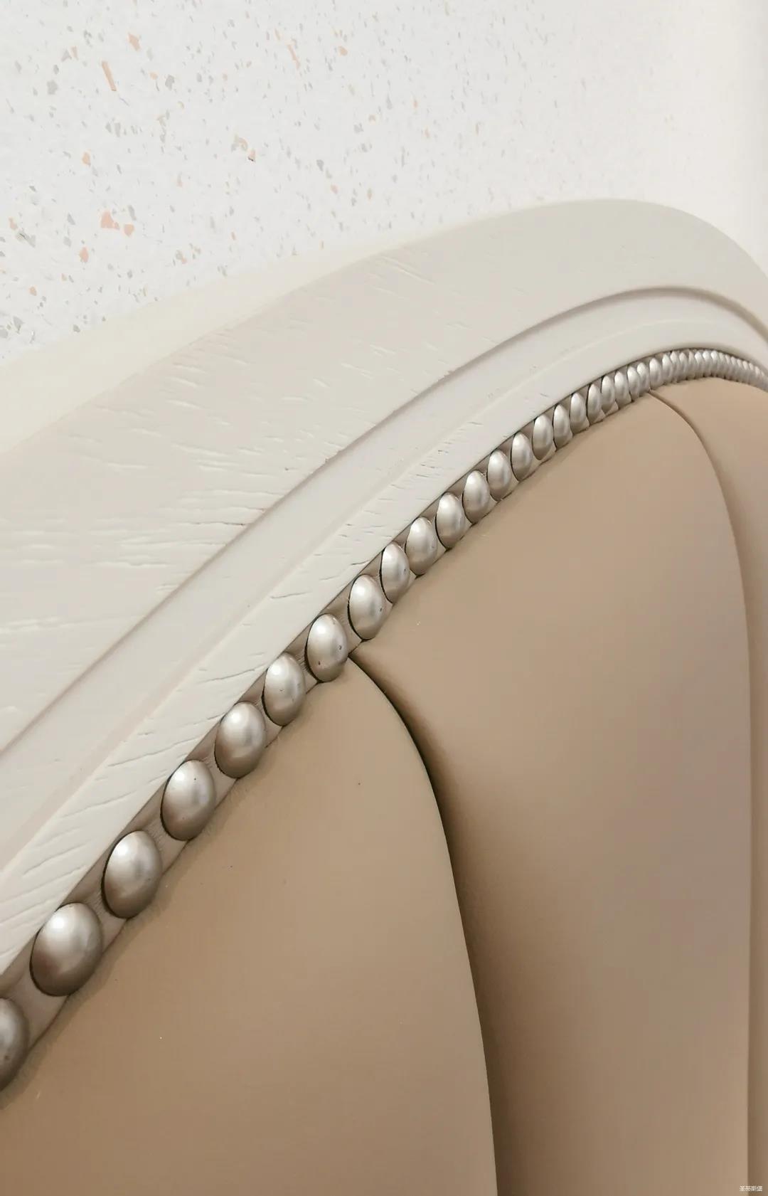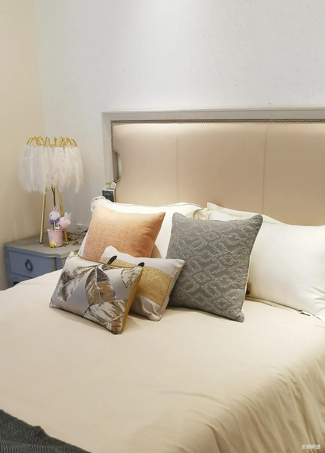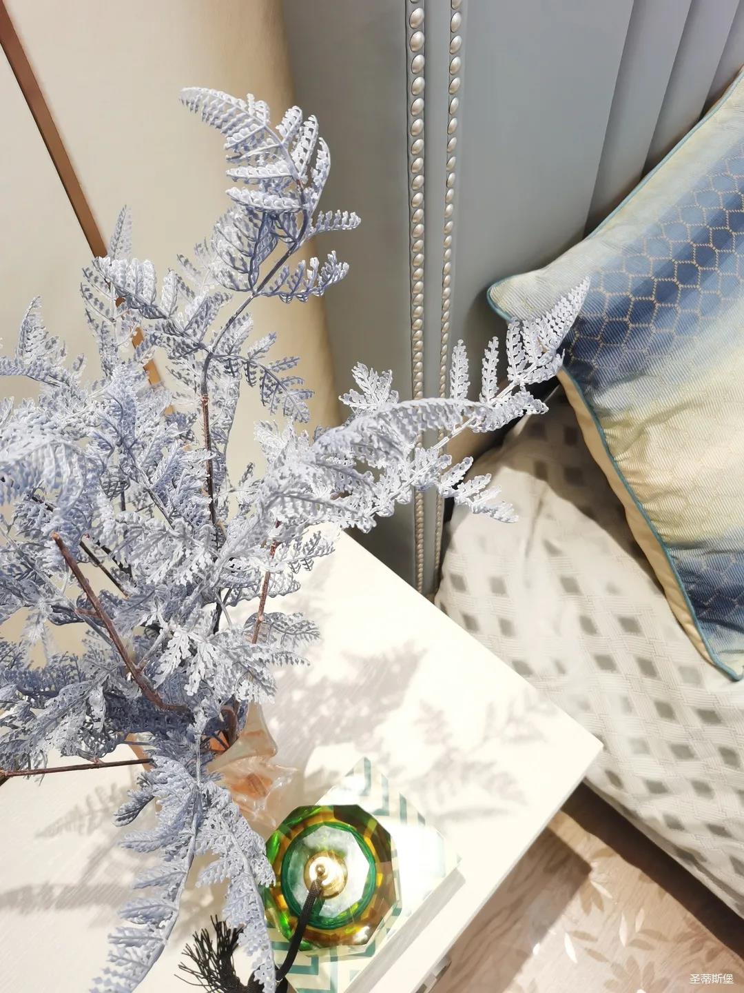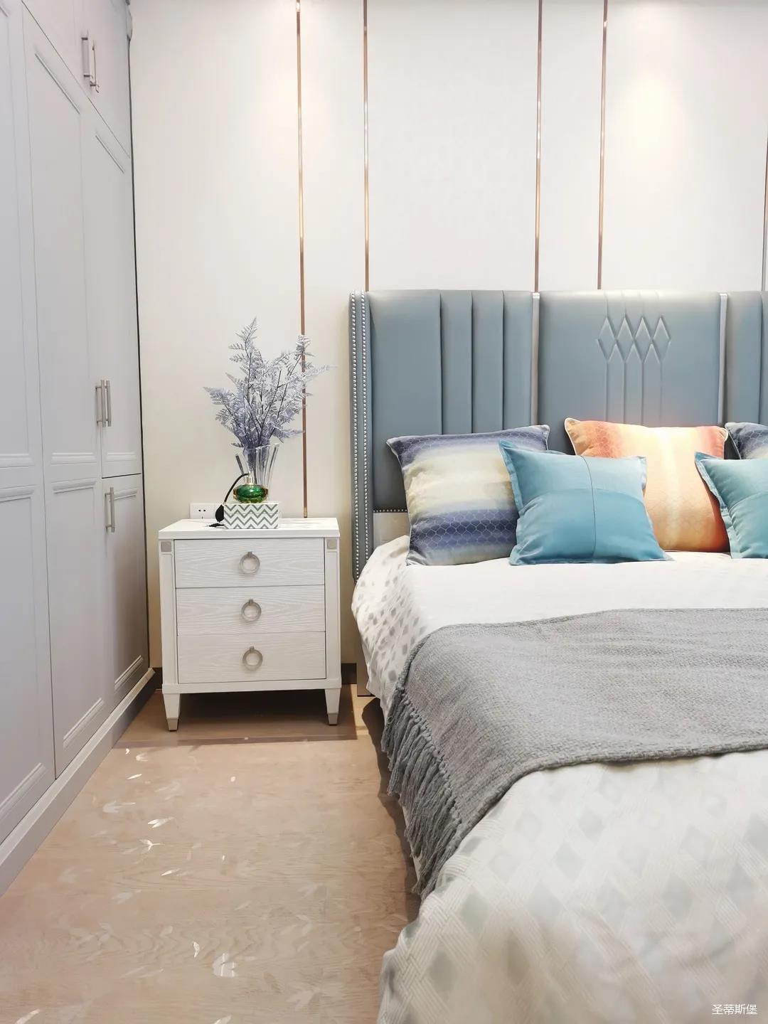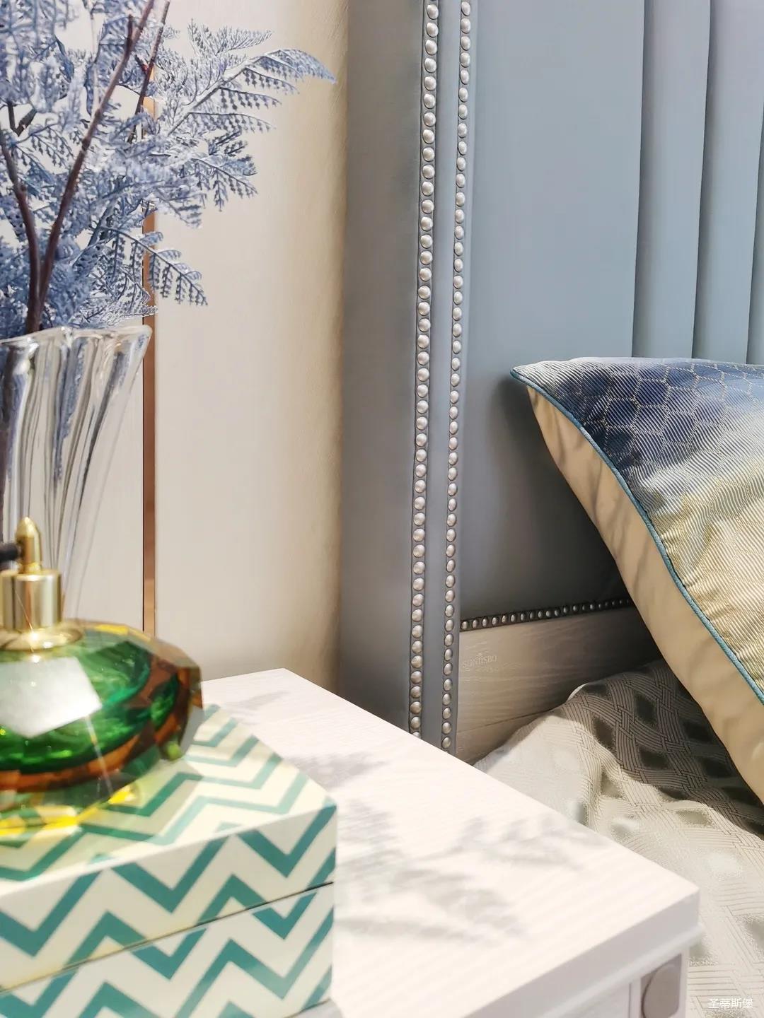 一樓的房間業(yè)主是作為長(zhǎng)輩房,采用輕奢的背景墻面,結(jié)合亮眼的金屬線條設(shè)計(jì),空間顯得時(shí)尚又不失沉穩(wěn)。莫蘭迪色的淺藍(lán)床屏,在無(wú)主燈設(shè)計(jì)與自然光線的碰撞下醞釀出不同的光影美感。