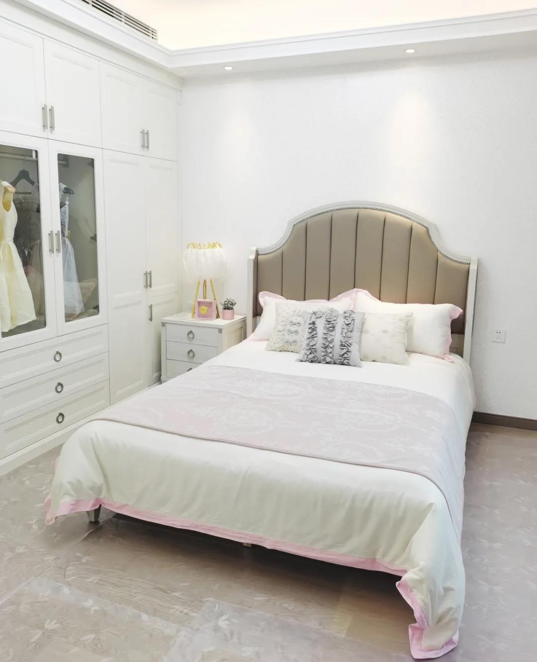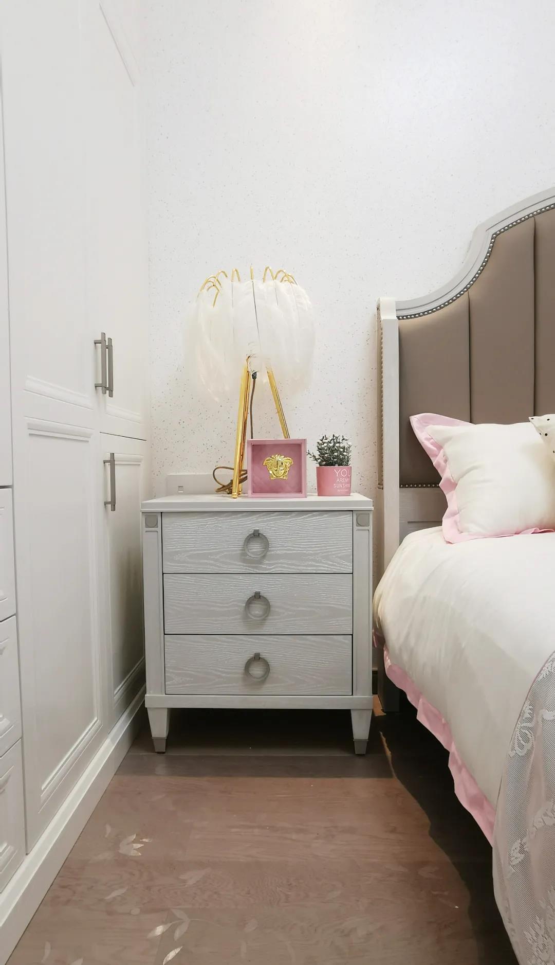 少女粉軟包床屏搭配仙氣十足的羽翼臺(tái)燈,讓空間顯得尤為夢(mèng)幻。功能與顏值兼具的定制衣柜,與溫柔的空間相得益彰,簡(jiǎn)單優(yōu)雅的同時(shí)也不失童趣。