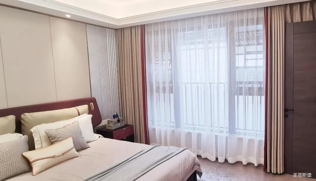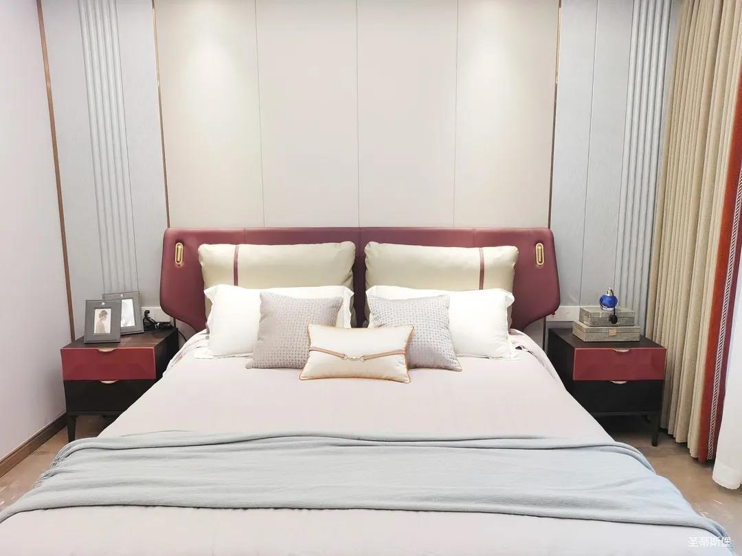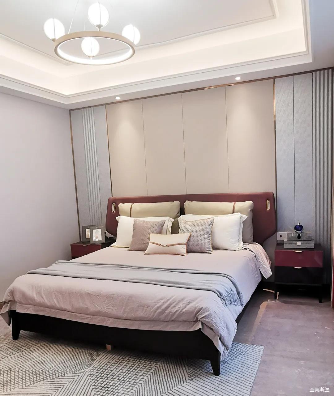 三樓的主人房設(shè)計(jì)風(fēng)格更偏向簡(jiǎn)約,浪漫的酒紅色床屏運(yùn)用了曲面造型,融合了極簡(jiǎn)主義美學(xué)和輕奢元素,小型夜間感應(yīng)燈設(shè)計(jì)讓每一處細(xì)節(jié)都充滿(mǎn)著時(shí)尚優(yōu)雅的氣息。夜間倚靠在厚實(shí)的軟包上,時(shí)光好像在不知不覺(jué)中慢了下來(lái),讓我們能品味和咀嚼生活的氛圍。