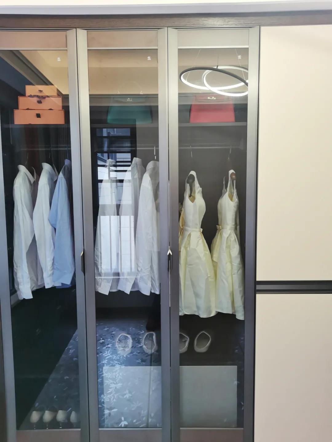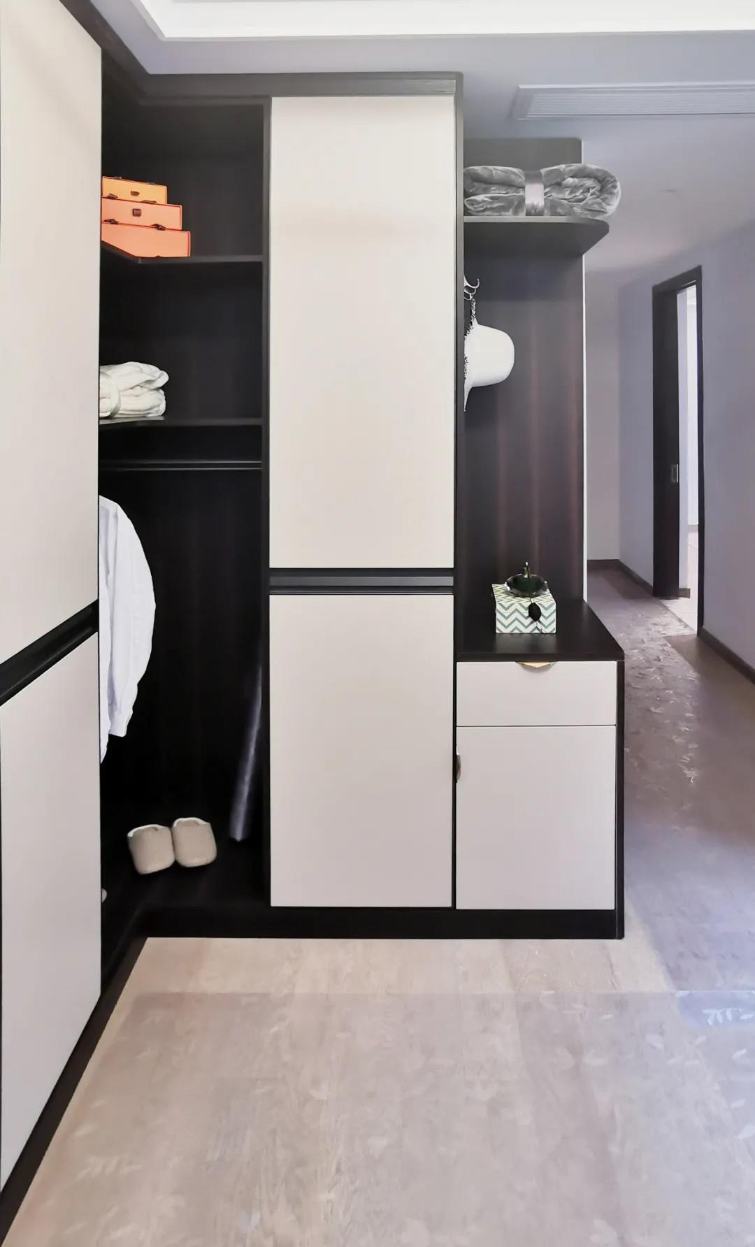 衣帽間以現(xiàn)代極簡(jiǎn)設(shè)計(jì)手法引入輕奢元素,借助實(shí)木與金屬組合打破了傳統(tǒng)儲(chǔ)物區(qū)的沉悶感,煙熏色橡木紋的定制柜體,色澤好似一杯溫暖醇香的摩卡,令空間層次感與立體感的格調(diào)頓生,予以沉穩(wěn)舒適感官體驗(yàn)。