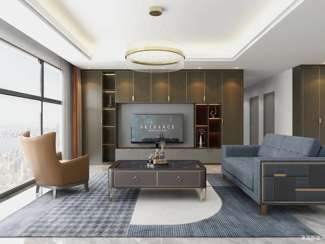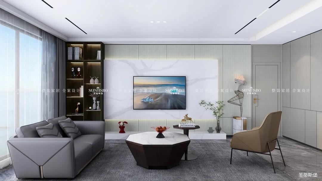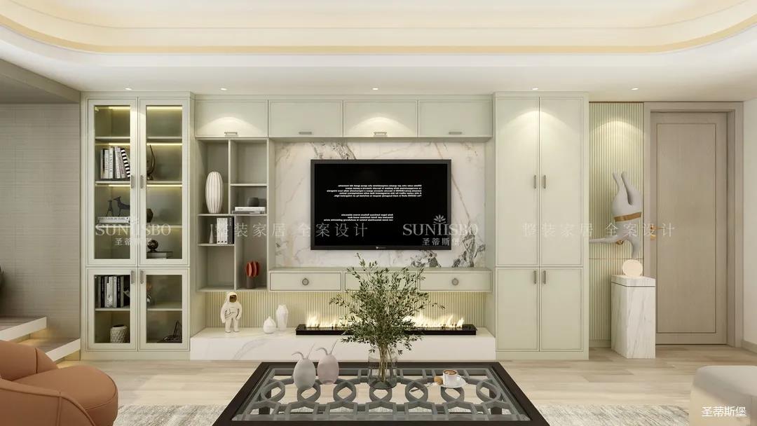 它以英倫爵士灰為柜體主調(diào),背景墻定制了整墻的儲(chǔ)物柜,色調(diào)懷舊復(fù)古的同時(shí)還夾帶著時(shí)尚摩登氣息,明暗收納合理分區(qū),電視被實(shí)木飾面包圍,使空間視覺(jué)得以延伸,美觀收納兩不誤。