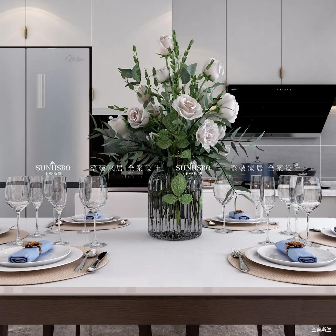 餐廳中大理石肌理的桌面自然袒露,自然親膚的觸感、皮革質(zhì)感的現(xiàn)代餐椅坐感舒適自然。沉穩(wěn)的實(shí)木材質(zhì)延伸,精致的瓷白餐盤搭配金屬質(zhì)感的物件,通透的玻璃器皿點(diǎn)綴其中,契合了業(yè)主對品質(zhì)生活的追求。