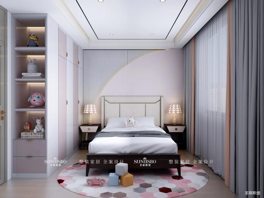 兒童房相對于其他空間更立體自然,幾何紋理的床屏和床頭柜延續(xù)了空間獨(dú)特的設(shè)計(jì)元素,菱格形的地毯,色彩交錯(cuò)排列,滿足了兒童房應(yīng)有的童真與想象力。粉白相間的定制收納,搭配同色系充滿童趣的動物公仔擺件,儼然成為了兒童的夢幻小天地。