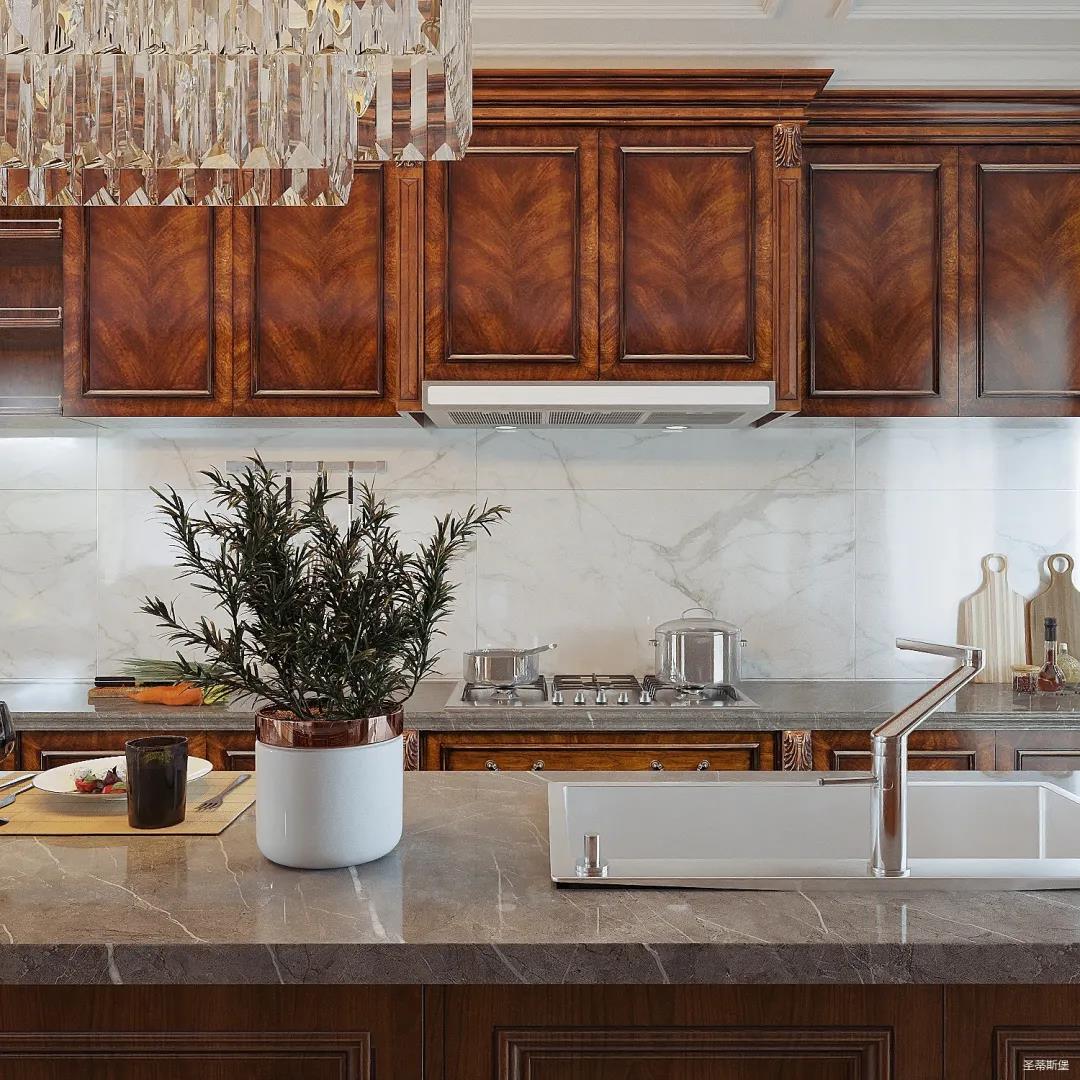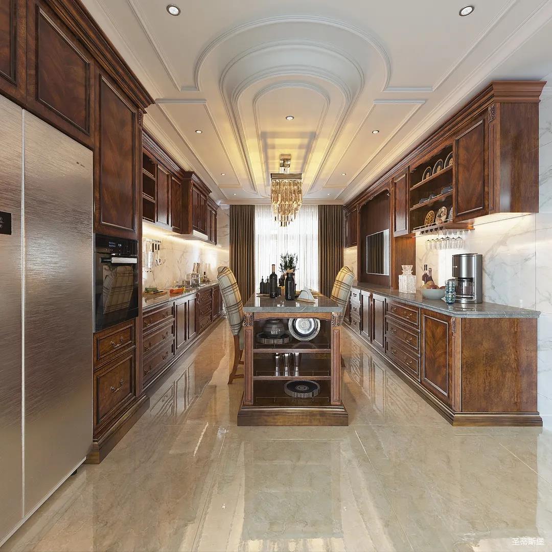 西廚設(shè)計更為統(tǒng)一,女業(yè)主喜好柔美優(yōu)雅的視覺效果,因此設(shè)計師特意將吊頂轉(zhuǎn)角做了圓弧處理,使冷峻的空間略帶圓潤,形成精致協(xié)調(diào)的空間格局。簡潔的石膏吊頂與吧臺一致延伸,讓廚房視覺空間得以擴大。金屬元素水晶吊燈,增加了空間的精致感,美式定制柜體將古典元素與現(xiàn)代電器相糅合,交錯產(chǎn)生一種自然的違和感。