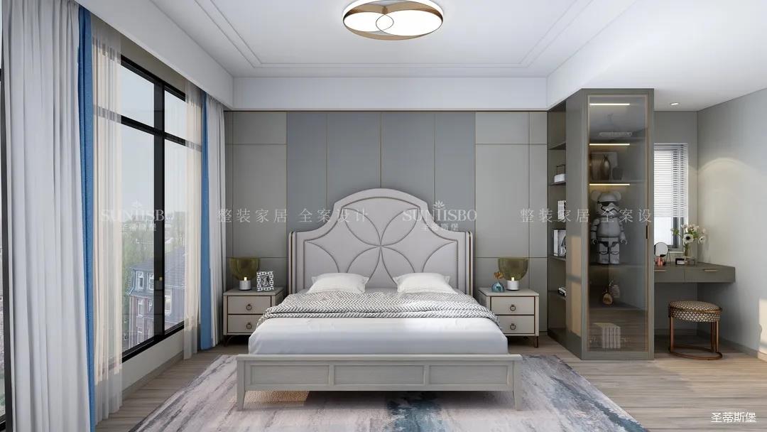 主臥的設(shè)計(jì),整體風(fēng)格與色調(diào)的一致,通過(guò)空間設(shè)計(jì)與軟裝細(xì)節(jié)的調(diào)控,顯得主臥多了一份寧?kù)o與放松。四照花床屏的細(xì)節(jié)、材質(zhì)色彩的把握、隔斷小書(shū)桌的設(shè)計(jì),無(wú)不體現(xiàn)著設(shè)計(jì)師獨(dú)特的品位和全案設(shè)計(jì)的能力。