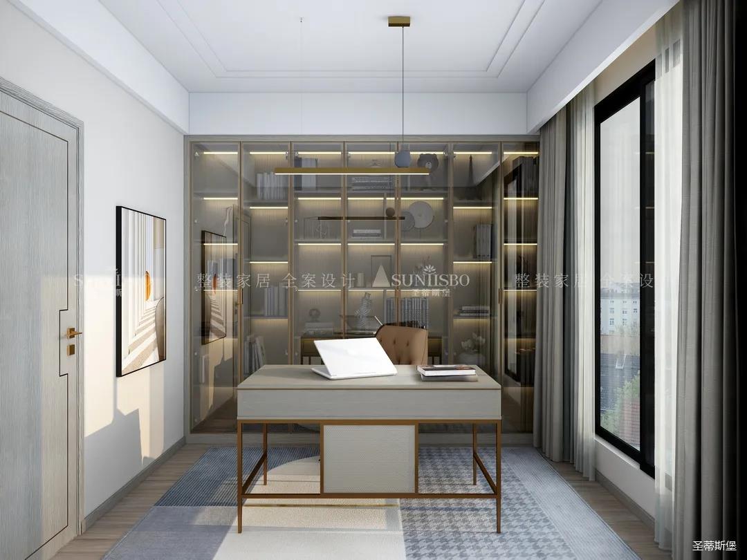 書(shū)房在陽(yáng)光下襯得通透自然,半透明的灰玻利用高級(jí)且親和的色彩貫穿著柜體與空間的互動(dòng),溫潤(rùn)的木質(zhì)、輕奢的金屬以拼合的狀態(tài),將屋主感性與時(shí)尚的生活理念滲透進(jìn)書(shū)房空間。不同材質(zhì)的搭配為空間增添平衡感,使得緊繃的工作狀態(tài)得到放松。