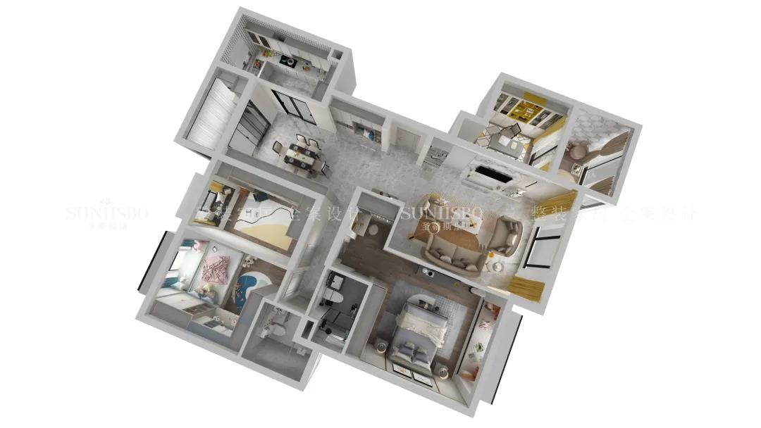 兒童房摒棄了傳統(tǒng)榻榻米的呆板與嚴(yán)肅,延續(xù)主臥輕奢雅致的空間氛圍,以木質(zhì)為主材質(zhì),利用面板的線條帶來視覺上的延伸,將童趣與理性相融表現(xiàn)兒童應(yīng)有的學(xué)習(xí)氛圍與生活習(xí)慣。開放式展示區(qū)應(yīng)用藍(lán)色點綴,再次強(qiáng)化了空間專屬兒童的活躍格調(diào),也呈現(xiàn)了設(shè)計師在材質(zhì)與色彩運用上的精細(xì)與專業(yè)。