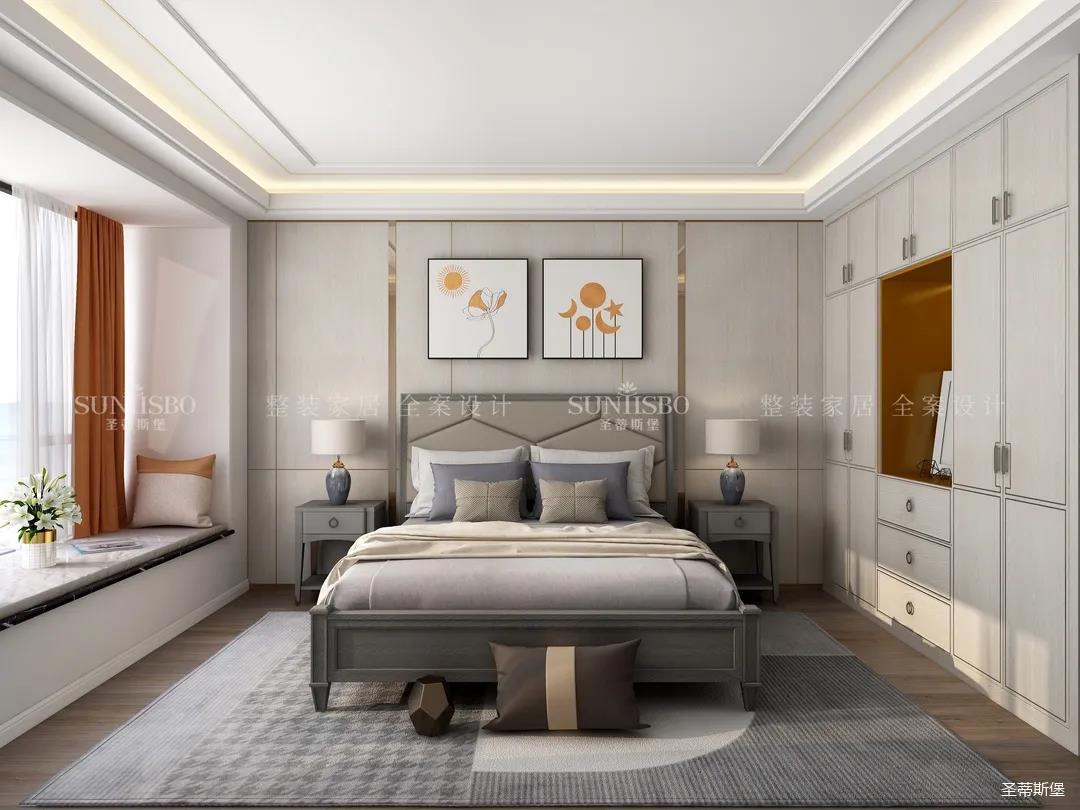 主臥隨著優(yōu)雅的金屬線條鋪開,臥室內(nèi)的靜謐感有序的傳遞著,帶有溫度的木飾面與溫潤的實木地板在同一空間交匯,充滿輕奢質(zhì)感。明亮橙的色彩點綴讓空間活躍的格調(diào)不斷擴(kuò)充,仿古白的定制柜體在空間形成若隱若現(xiàn)的視覺平衡,將溫暖,柔和組合成日常的睡眠氛圍。