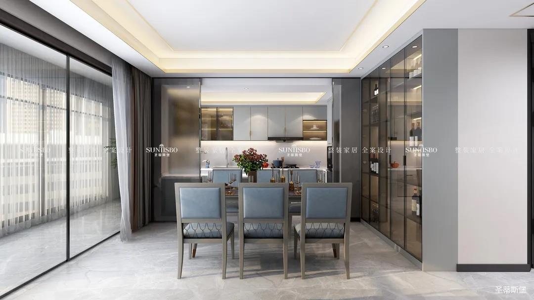 設(shè)計師通過對居者在空間中互動關(guān)系的細致設(shè)想,遵循經(jīng)典的簡奢風(fēng)格設(shè)計,細膩考究人居與空間關(guān)系,反復(fù)推敲布局,將客餐廳橫列排布,增加居者的交流互動。