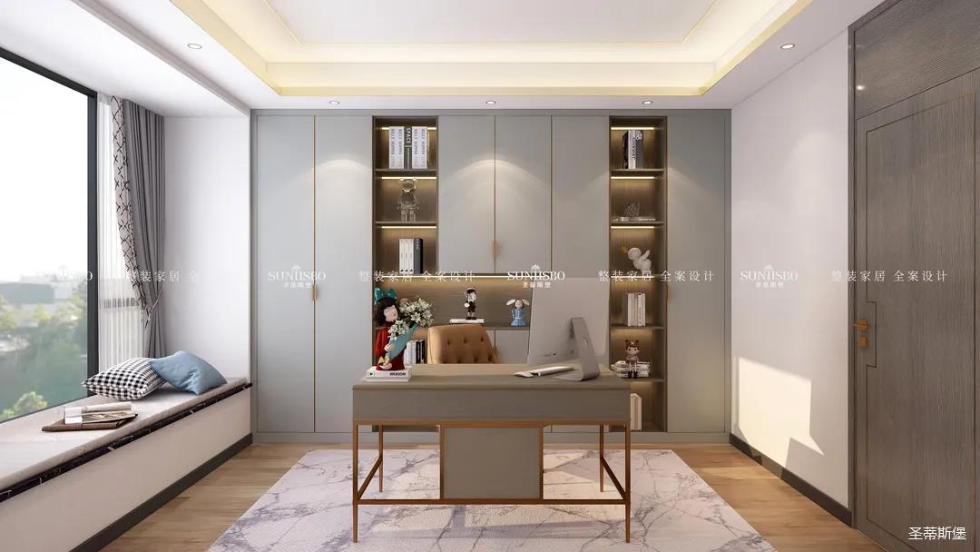 書房以淺灰作為主色調(diào),設(shè)計師在整個空間沒有選擇其他顏色進行相互雜糅,讓書房完全釋放了簡約的風(fēng)格,無主燈的設(shè)計理念更是突出了空間層次感。細膩且富有光澤的金屬元素鑲嵌,在繁華的都市中傳遞著特有的文化氛圍。