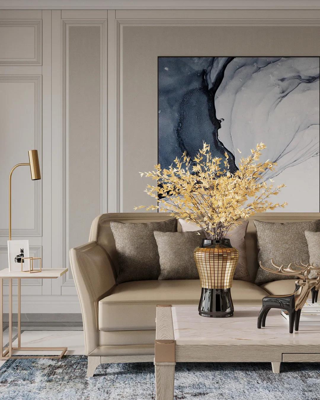 本案定位美式輕奢風(fēng)格,設(shè)計(jì)師提取了業(yè)主喜歡的顏色添加至空間中,并運(yùn)用金屬元素滲透到每一個(gè)空間,統(tǒng)一色調(diào)。在設(shè)計(jì)上,格局大而不空,以?xún)?yōu)美線(xiàn)條雕琢空間語(yǔ)言,材質(zhì)肌理間的碰撞融合,打造出層次豐富的藝術(shù)感。