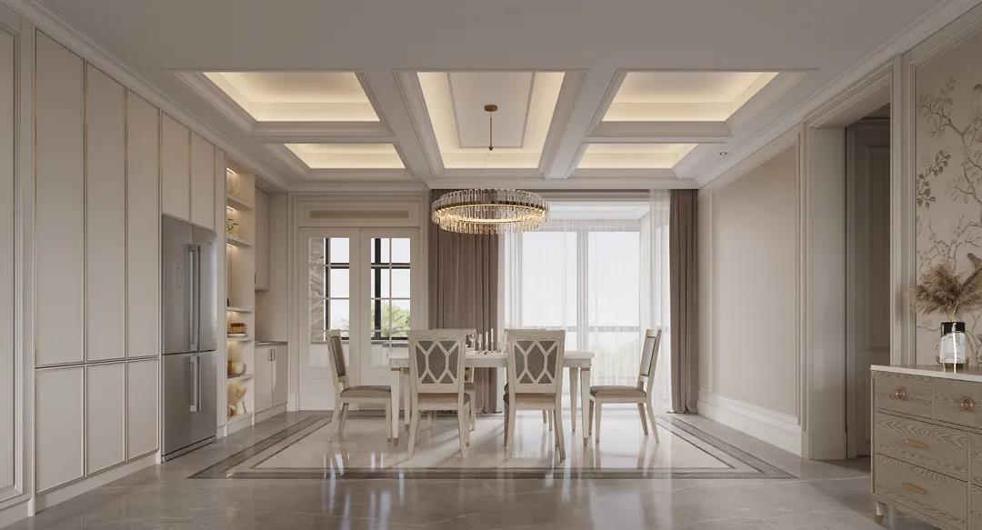 美輪美奐的天花吊頂,巧奪天工的護(hù)墻線(xiàn)雕,硬朗的美式線(xiàn)條和明亮金屬的輕奢質(zhì)感,均展現(xiàn)著高雅與浪漫的生活腔調(diào)。