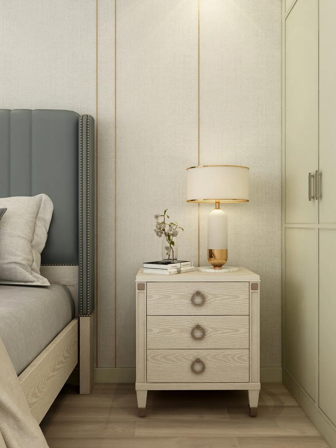 次臥背景墻兩端是對(duì)稱(chēng)式設(shè)計(jì),以淡雅的暖色為主,